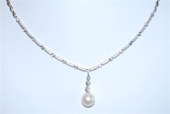 A SOUTH SEA PEARL AND DIAMOND NECKLACE - Comprising a central pearl and diamond drop, suspended on articulated baton links spaced with collet set diamonds and a fancy link chain in platinum, total length 450mm, independent valuation available.