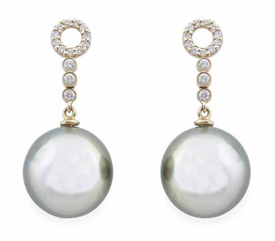 Each earring comprising a round pearl of green grey hues, measuring 13.7mm, suspended on a diamond set drop and circular stud fittings, in 18ct gold.