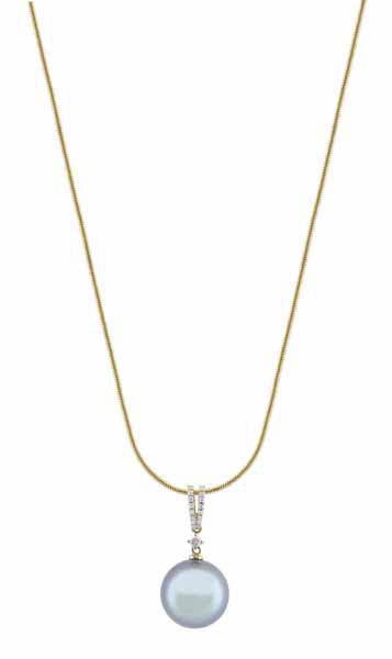 The round pearl of green grey hues, measuring 14.4mm, to a diamond set bale, in 18ct gold.