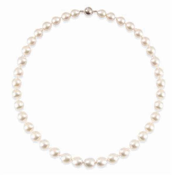 Comprising thirty nine semi baroque pearls of silver white hues, measuring 9.1mm to 11.5mm, to a 9ct white gold ball clasp, total length 485mm.