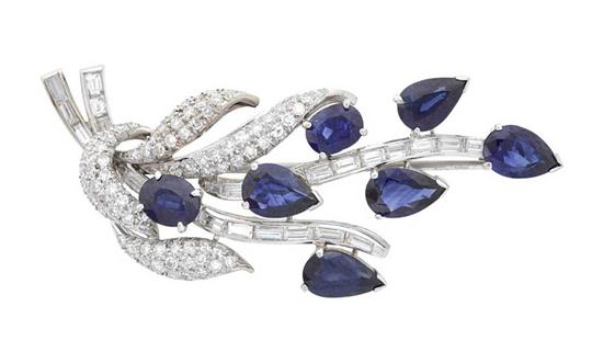 Of spray design, set with varying cuts of sapphires together totalling 6.0cts and single and baguette cut diamonds, in platinum, independent valuation available.