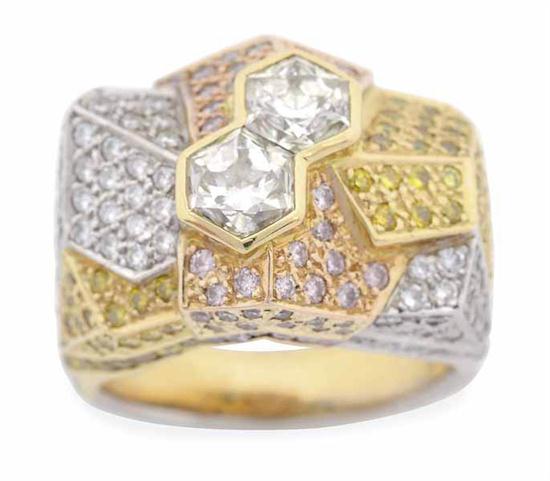Of modern geometric design, centred with two hexagonal cut diamonds surrounded by sectional pave set pink, yellow and white round brilliant cut diamonds, in tri-colour 18ct gold, independent valuation avaialable, ring size J-K.