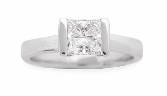 The princess cut diamond weighing 1.03cts, edge set in 18ct white gold, GIA certificate and independent valuation available, ring size K-L.