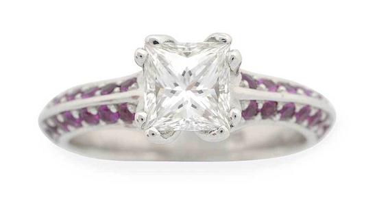 Centred with a princess cut diamond weighing 1.16cts claw set within ridged shoulders pave set with rubies, in 18ct white gold, GSL report and independent valuation available, ring size K-L.