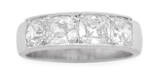 The squared engraved band set with four old style vintage cut diamonds totalling 1.66cts, in millegrain decoration, in 18ct white gold, independent valuation available, ring size N-O.