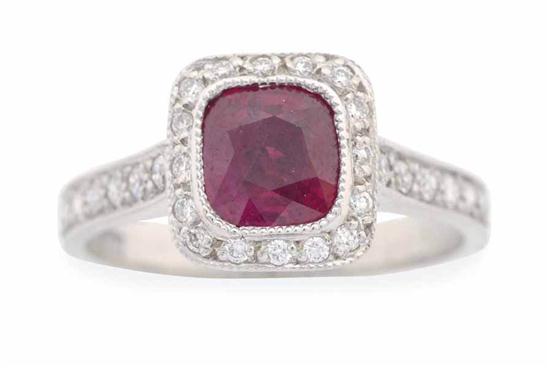 Centred with a cushion cut ruby weighing 1.19cts, within a border of round brilliant cut diamonds and diamond set shoulders in millegrain decoration, in 18ct white gold, independent valuation available, ring size M-N.