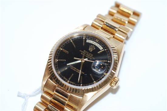 Automatic movement, circular black dial with raised baton numerals, day aperture at twelve, date aperture at three, signed case, dial and movement, 18ct gold case and conforming President bracelet bands, 36mm diameter, with box.