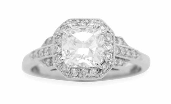Centred with a cushion cut diamond weighing 1.25cts within an octagonal border of round brilliant cut diamonds and stepped diamond set shoulders, in millegrain decoration, in 18ct white gold, independent valuation available, ring size L-M.