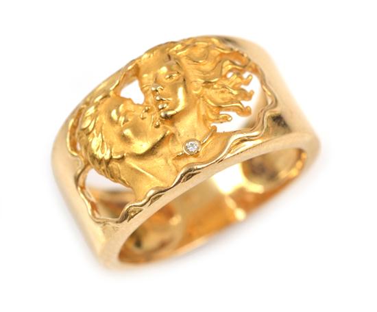 The wide band with central figural scene depicting a man and woman in embrace, with diamond detail, in matt and polished finish, in 18ct gold, ring size K-L.