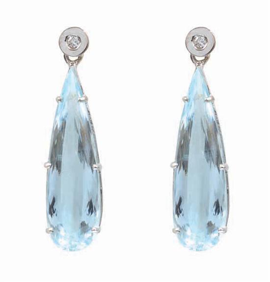 Each earring claw set with an elongated pear shaped aquamarine suspended below a diamond set bale, to post and butterfly fittings, in 18ct white gold, independent valuation available.