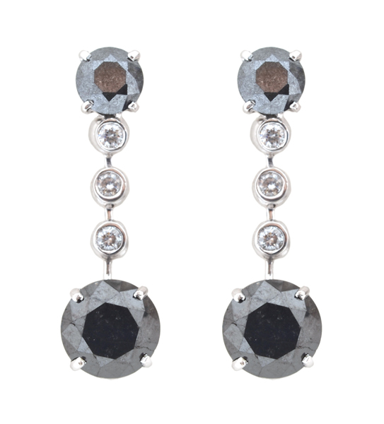Each pendant earring claw set with two black diamonds totalling 5.53cts, separated by three white brilliant cut diamonds, to post and butterfly fittings, in 18ct white gold, independent valuation available.
