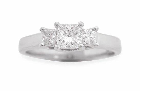 Claw set with three princess cut diamonds totalling 1.01cts, in 18ct white gold, independent valuation available, ring size N