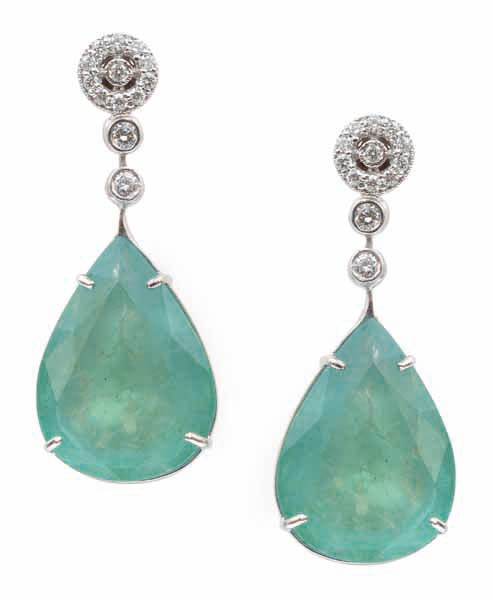 Each earring claw set with a pear cut emerald weighing 16.85cts, suspended below a diamond set bar and cluster surmount, to post and butterfly fittings, independent valuation available.