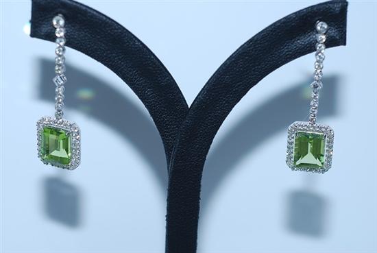 A PAIR OF PERIDOT AND DIAMOND EARRINGS - Each earring comprising an emerald cut peridot weighing 2.75cts, within a border of round brilliant cut diamonds on articulated diamond set drops to a stud fitting, in 18ct white gold.