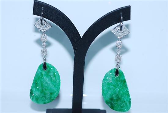 A PAIR OF JADE, ONYX AND DIAMOND EARRINGS - Each earring comprising an intricately carved jade panel suspended below onyx and diamond set drops of geometric design, to shepherd hook fittings, in 18ct white gold.