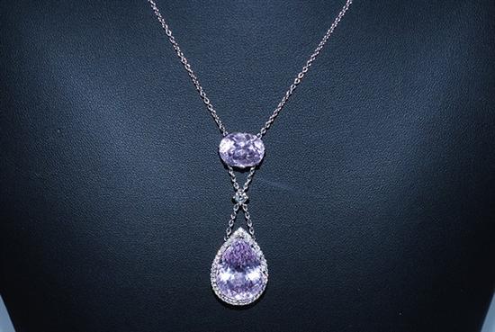 A KUNZITE AND DIAMOND PENDANT - Comprising a pear cut kunzite and diamond cluster suspended below a round brilliant cut diamond and an oval kunzite, on an integral trace chain in 18ct white gold.