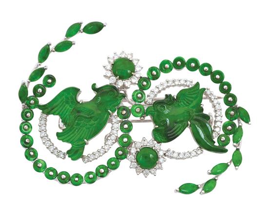 The translucent green birds of intense green colour within a jade and diamond set frame, in 18ct white gold.