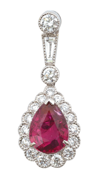 Comprising a teardrop shaped ruby and diamond cluster suspended below an articulated diamond set bale, in 18ct white gold, GRS certificate available stating ruby is not heat treated.