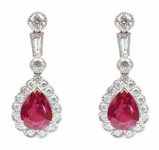 Each earring comprising a teardrop shaped ruby and diamond cluster suspended below an articulated diamond set drop to post and butterfly fittings, in 18ct white gold, GRS certificate available stating ruby is not heat treated.