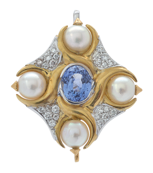 The diamond shaped plaque of modern design, centred with an oval sapphire weighing 2.50cts, within a quatrefoil of cultured pearls and pave set diamonds, in 18ct gold, retailed by Makers Mark.