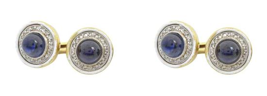 Each double ended cufflink centred with a sapphire cut en cabochon within a surround of rose cut diamonds and enamel, in 18ct gold.