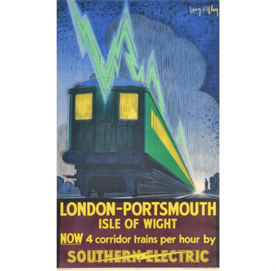 circa 1937, lithograph in colours, 'London- Portsmouth/ Isle of Wight/ Now 4 corridor trains per hour by/ Southern Electric', signed 'Jean d'Ylen' upper right corner, 'Printed in Great Britain by J. Weiner Ltd. London. W.C.1.' to lower margin with print run and date '1500/1938, framed, lower left corner creased, Condition B+