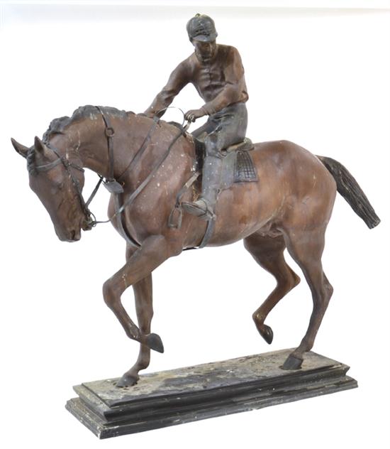 cast as a jockey and mount, raised on a plinth base, circa early 20th century
