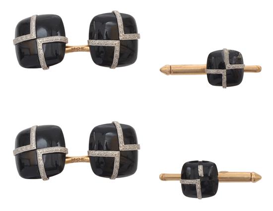 The double ended onyx plaques with applied decorative white gold detail, with two shirt studs of conforming design, in 14ct gold.