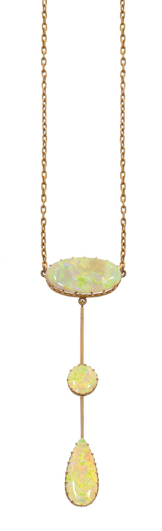 Comprising a central oval opal suspending an articulated opal set knife edge drop, on an integral trace chain in 15ct gold.