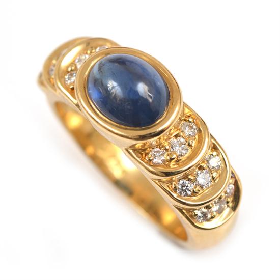 Centred with an sapphire cut en cabochon, flanked by curved stepped shoulders set with round brilliant cut diamonds, in 18ct gold, with origninal papers, ring size K-L.