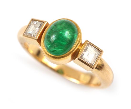 Centred with an emerald cut en cabochon, flanked by an emerald cut diamond to either side, all bezel set in 18ct gold, ring size N-O, original paperwork available.