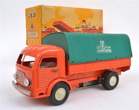 RARE CLOCKWORK JRD 404/E SIMCA CARGO TRUCK 'TOILE DICKSON', FRENCH, ORANGE PRESSED STEEL CAB AND CHASSIS, GREEN BACK WITH GREEN CLOTH CANOPY, WHITE PRINTING TO SIDE 'TOILE DICKSON 25 ANS DE METIER' (DICKSON CANVAS 25 YEARS OF EXPERIENCE), BATTERY OPERATED HEADLIGHTS, KEY NOT PRESENT, IN ILLUSTRATED BOX (VG-E BOX G) 33.5CM LONG