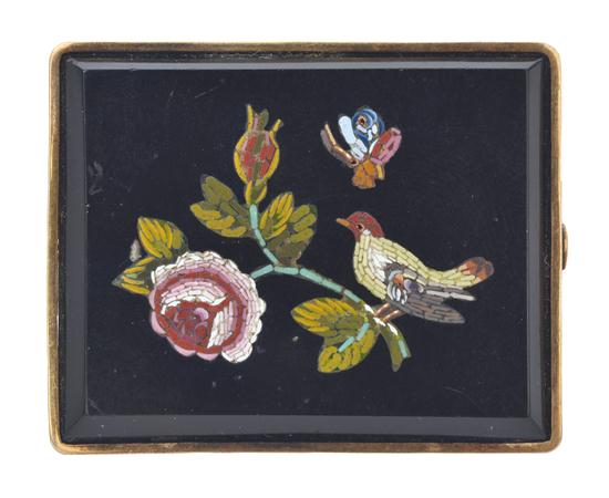 The rectangular onyx with a floral mosaic inlay, in an 18ct gold frame.