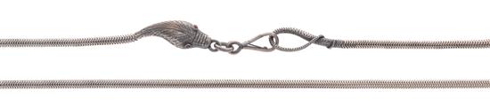 The tubular snake chain terminating in a serpents head with red stone set eyes and coiled tail in silver, total length 1400mm.