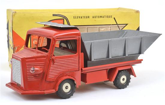 J.R.D 294E GRANDE BENNE BASCULANTE (LARGE DUMP TRUCK - FRANCE), TINPLATE, RED CAB AND CHASSIS, SILVER SPRING-LOADED TIPPER, LIGHT GLOBE HEADLIGHTS, BOXED (G BOX F) 19CM X 45CM X 17CM