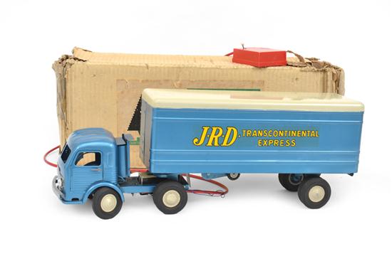 France, metallic blue cab and trailer, cream trailer roof, yellow 'J.R.D. TRANSCONTINENTAL EXPRESS' decals to sides, red plastic battery operated 'tele bloc' untested (G box F)