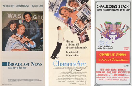 all Australian daybill posters: 'When Harry Met Sally', Castle Rock, 1989, signed by Billy Crystal; 'Good Morning Vietnam', Touchstone, 1987, signed by Robin Williams; 'Broadcast News', 20th Century Fox, 1987, signed by Holly Hunter and William Hurt; 'Charlie Chan & The Curse of the Dragon Queen', United Artists, 1980, signed by Peter Ustinov; and three others signed by Whoopi Goldberg and a copy of a photograph at time of signing (2) and Cybill Shepherd (7)
