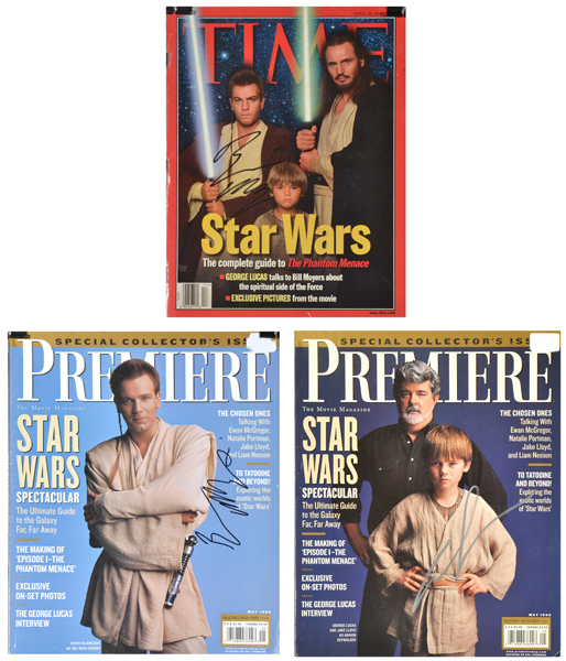 including a limited edition 'Star Wars Trilogy ' poster signed by George Lucas and four other unsigned examples of the same poster; and three magazines featuring Star Wars related front covers, two signed by Ewan McGregor, one signed by George Lucas; and a poster for 'Brassed Off' signed by McGregor and Pete Postlethwaite (9)
