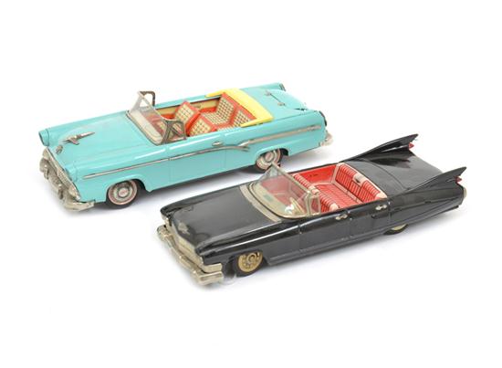Japan, black Cadillac with cream plastic steering wheel and red and pink lithographed inner; and turquoise Ford Fairlane with orange, cream and yellow lithographed interior, both unboxed (VG-E) (2)