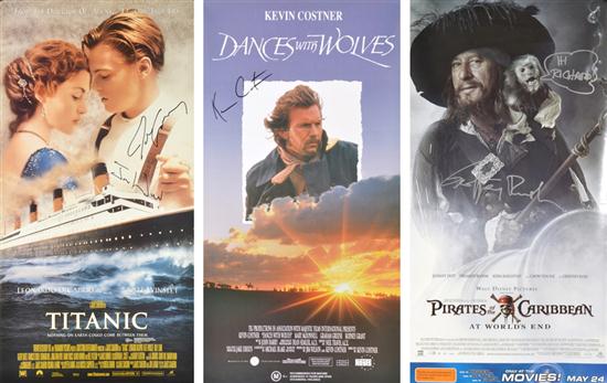 majority Australian daybills including 'Titanic' signed by James Cameron and producer Jon Landau; 'Pirates of the Caribbean At World's End' signed by Geoffrey Rush; 'Independence Day' signed by Will Smith; 2 posters for 'Jurassic Park' signed by Sam Neill; 'Waterworld' signed by Kevin Costner and Dennis Hopper; 'Devil In A Blue Dress' signed by Denzel Washington and copy of photograph at time of signing; 'Seven' signed by Kevin Spacey; and 'Dances With Wolves' signed by Kevin Costner (9)