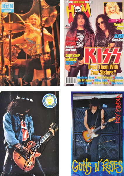 including five machine-print photographs from 'Hot Metal' magazine signed by Iron Maiden; Gene Simmons and Paul Stanley of Kiss; Faith No More; Jane's Addiction; and Skid Row; a photograph signed by Axl Rose; a machine-print photograph signed by Slash; a signed Izzy Stradlin poster and CD; and a cassette cover signed by Iron Maiden (9)