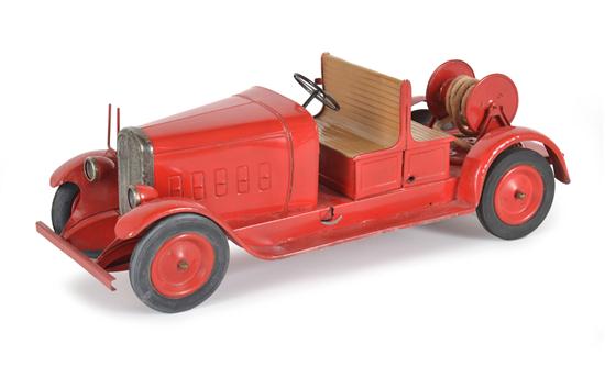 France, red with brown seats and rope hose to rear, steerable front wheels, unboxed (G)