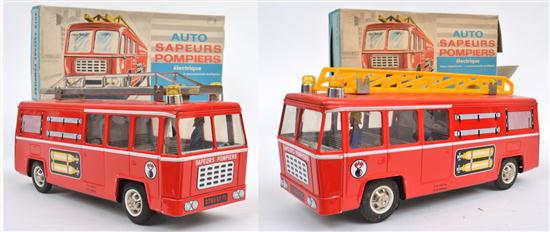 TWO JOUSTRA BATTERY OPERATED FIRE ENGINES (FRANCE), RED LITHOGRAPHED OUTER WITH COLOURFUL LITHOGRAPHED INNER, ONE WITH METAL LADDER TO ROOF, ONE WITH PLASTIC LADDER TO ROOF (VG BOXES F-G) (2) 16.5CM X 33CM X 10CM