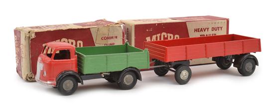 including GB/11 Commer Dump Truck, red and green (VG box P, heavily restored) and GB/19 Heavy Duty Trailer, red (E box G) (2)
