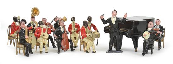 'Jack's Band' circa 1930s boxed set includes piano, cellist, cornet player, saxophonist, conductor, banjoist, bassoonist, accordion player, 9 x gold coloured chairs, missing piano player; and 'Jazz Band' circa 1924 includes saxophonist, banjoist, trombonist player, 2 x drummers, clarinettist and 6 x black chairs, 3 x chairs missing legs, unboxed (F-VG box G) (lot)