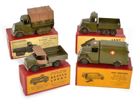 including 1512 Army Ambulance, 1959, army green body and hubs, stickers to sides and cab roof, silver trim, patient on stretcher and driver, black tyres, some crazing to paintwork; 1877 Beetle Lorry, army green body, brown cab roof, driver; 1455 British Army Covered Tender, army green with brown tinplate canopy and driver; and 1335 Six Wheel Army Lorry, army green, silver detail, with driver (VG-E boxes F-G) (4)