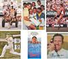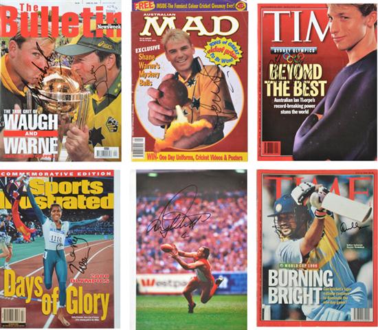 including an 'Australian Legends' poster signed in blue ink by Don Bradman; a black and white machine-print photograph signed in black felt pen by ten members of the 1948 Invincibles Australian cricket team including Don Bradman and Keith Miller; one with 7 signatures including Bradman; a copy of Time magazine signed on the front cover by Sachin Tendulkar; a copy of Bulletin magazine signed by Steve Waugh; two magazines signed by Shane Warne; a poster signed by Dawn Fraser; two magazines signed by Cathy Freeman and Ian Thorpe; and a booklet signed by Pele (a lot)