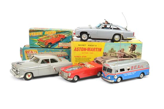 Japan, circa 1950s, Secret Agent's Aston-Martin Action Car, silver with colourful lithographed inner, with revolving license plate and other features; Marusan Toys Hit Friction Car Ford Sedan two-door, grey with beautifully coloured lithograph inner; Nomura Venus Ford friction operated, red with colourful lithographed inner and battery operated visible piston action; and Aoshin Friction R.C.A. TV. television news service car (G-E boxes P-VG) (4)