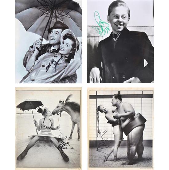 including seven 8 x 10 photographs signed by James Stewart, Micky Rooney, Douglas Fairbanks Jr., Oliver Stone, Debbie Reynolds, Brooke Shields and Olivia Newton John; a concert programme signed by Shirley MacLaine; and other subjects including Leslie Nielsen, Priscilla Presley and Drew Barrymore (a lot)