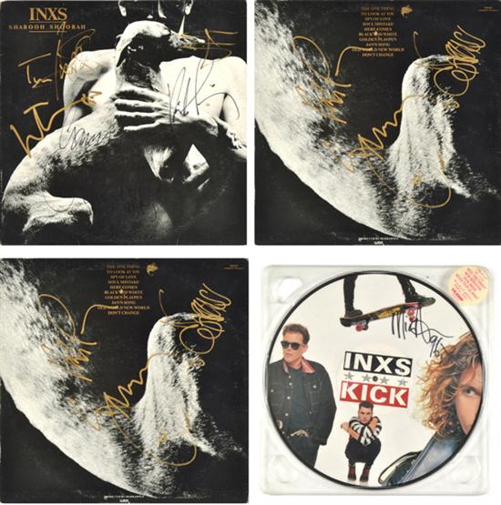 including a copy of the album 'Shabooh Shoobah' signed on the front cover in different inks; a picture disc album 'Kick' signed in black marker 'Michael Hutchence 96x'; and two machine print photographs signed by Michael Hutchence (4)